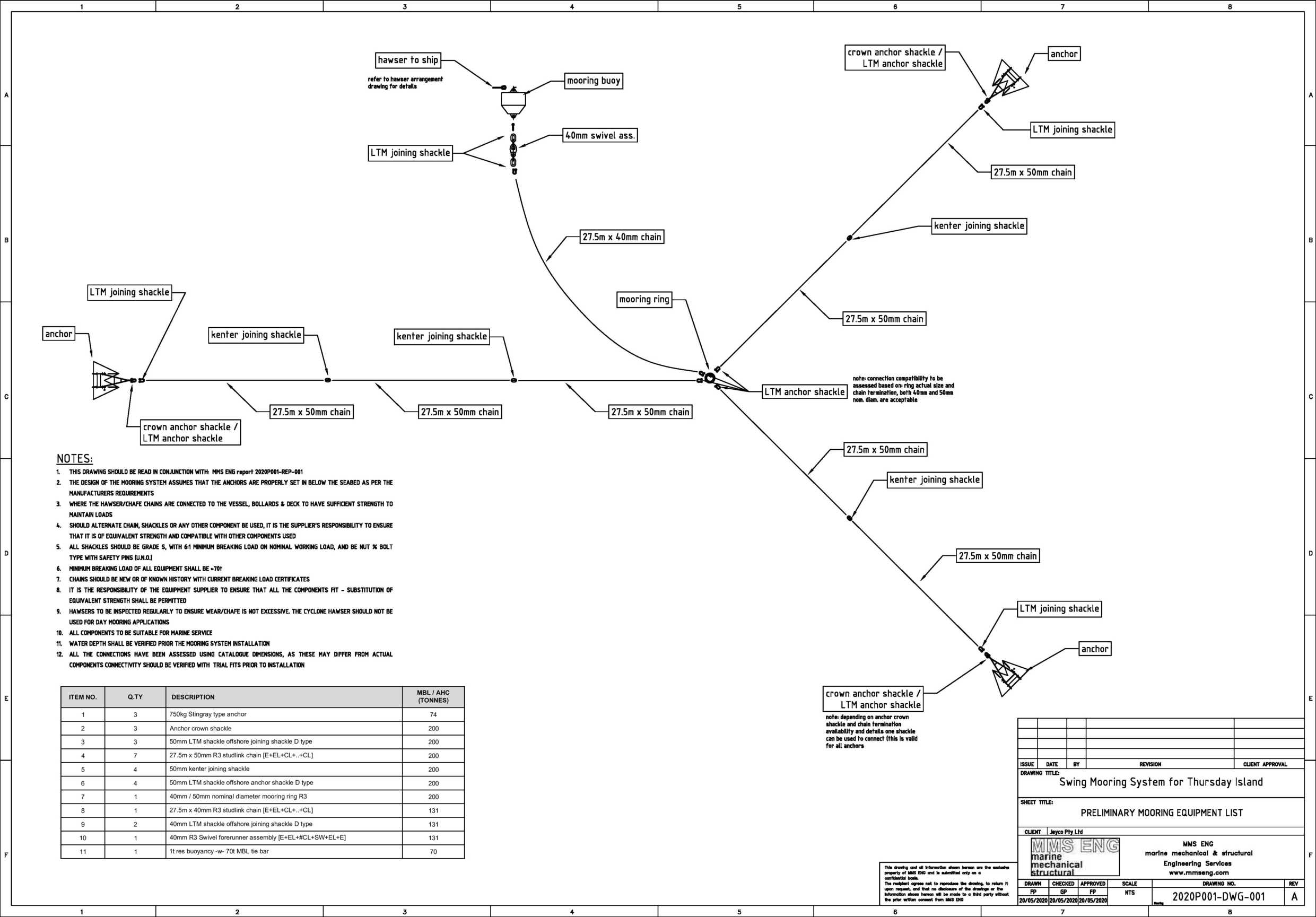 The mooring consists of 3 of 750 kg Stingray anchors and 55 m of 50 mm chain on each leg (82.5 m on the leg in the direction of the prevailing current) up to a 40 mm chain raiser and a 1.5 t reserve buoyancy buoy.